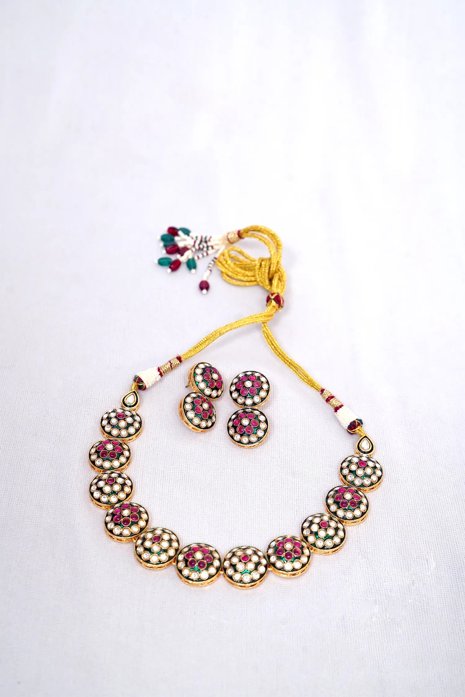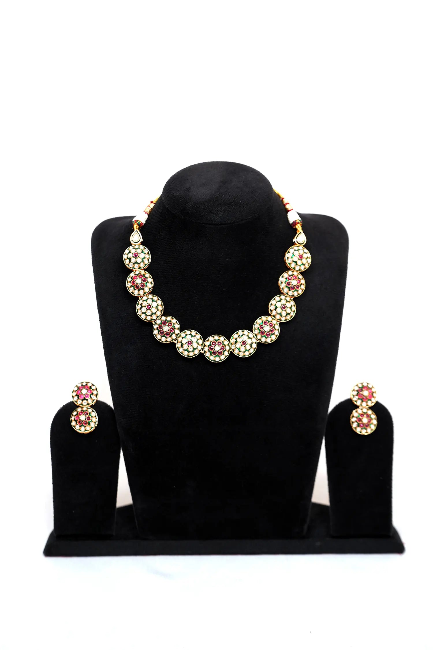 - Premium Kundan-style setting with faux polki, rubies, emeralds, and pearls